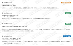 - クエリーループブロックを使用したトップページ用のお知らせ一覧用パターンです。